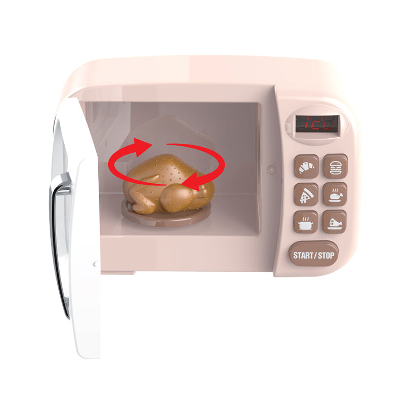 Không chỉ có máy xay sinh tố, chiếc lò vi sóng mini cũng là điểm nhấn với thiết kế cửa mở đóng linh hoạt và chức năng quay 360 độ bên trong. Bé sẽ được học cách làm nóng thức ăn, hiểu thêm về cách hoạt động của lò vi sóng một cách trực quan. Trong khi đó, máy nướng bánh mì giúp bé tưởng tượng quá trình làm bánh buổi sáng, với khay bánh mì nảy lên sau khi nướng chín – một hoạt động quen thuộc và gần gũi mà bé có thể tự mình thực hiện tại nhà.